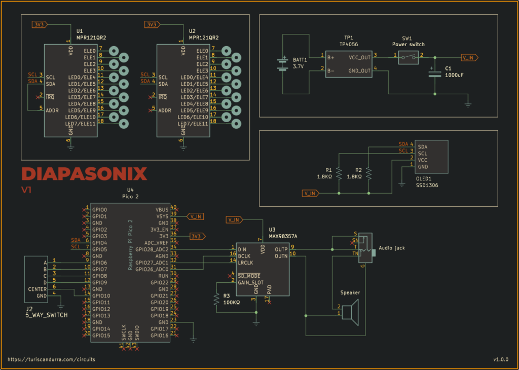 Diapasonix is an original, non‑commercial work created by Turi Scandurra for educational and hobbyist purposes only. The code, schematics, and documentation are provided “as‑is” without any warranties, express or implied.